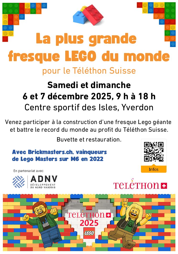 Ce week-end, le centre sportif des Îles à Yverdon se transforme en un immense chantier de Lego. Avec 300 000 briques et 24 mètres de fresques, l'objectif est de battre le record du monde de la plus grande fresque Lego. Petits et grands peuvent participer en achetant un plan de briques pour 10 francs et en construisant leur propre losange. L'événement soutient le Téléthon suisse, combinant créativité et solidarité. Venez découvrir les sites emblématiques du Nord-Vaudois en Lego, avec des food trucks et une buvette pour agrémenter votre visite.